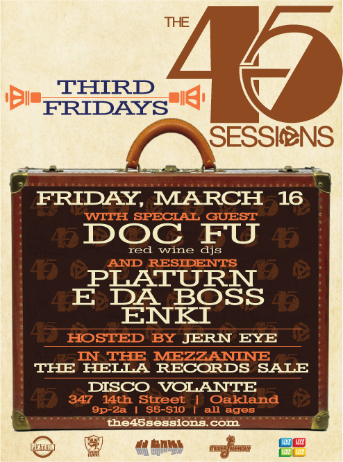 The super homie Doc Fu joins the Sessions this month, guaranteeing a rowdy and funky good time. DJ Enki holds it down while E Da Boss and Platurn take the Sessions to SXSW. Spread the word y’all!